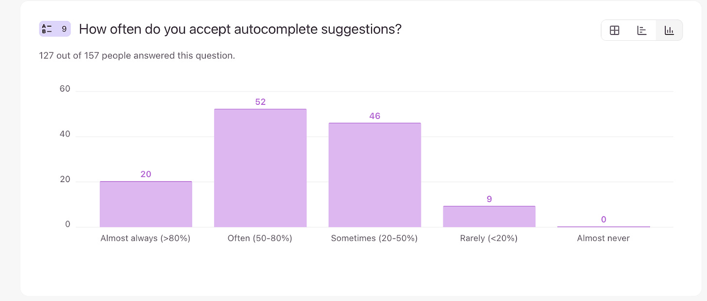 The near absence of “rarely” and “almost never” responses implies that people who keep autocomplete enabled generally find real value in it, rather than leaving it on and ignoring the suggestions.