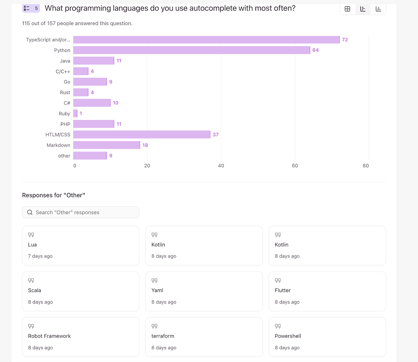 The “other” responses reveal an interesting long tail. Infrastructure-as-code tools like Terraform and YAML, mobile and cross-platform frameworks (Kotlin, Flutter), and niche languages (Lua, Scala, Robot Framework) show that users are pushing autocomplete into more specialized domains beyond mainstream web development.
